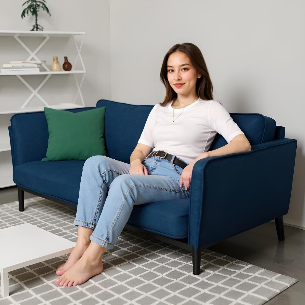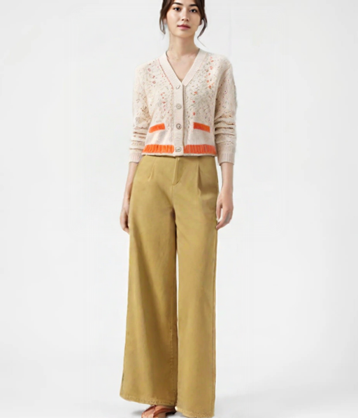 平置きのアイテム群を着こなしている事例、室内でくつろいでいるシーン